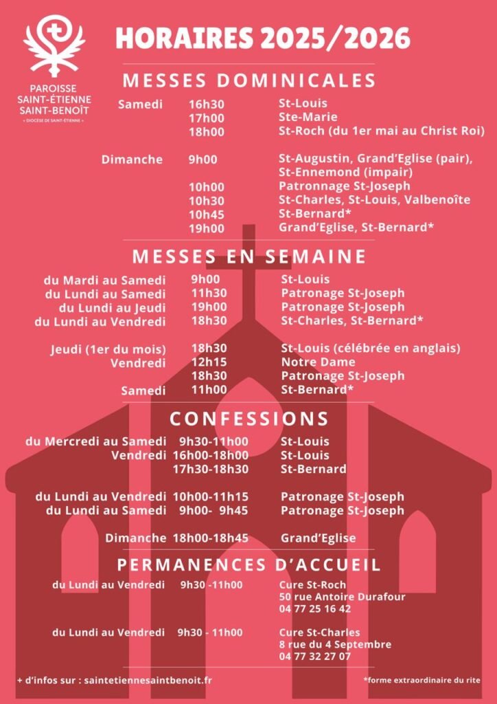 Publication publiée :17/10/2025 Post category:actualités / agenda / Liturgie Temps de lecture :1 min read Horaires 2025-2026 Vous devriez également aimer Homélie du 9 Janvier 2025 | Diacre Christophe Donnet 18/01/2025 Messe en Rite Maronite | Samedi 22 Février à St-Louis 19/02/2025 Initiation à l’Adoration pour les 4 à 10 ans 14/03/2025 Read more articles Article précédentAux Laïcs en Mission Ecclésiale du diocèse de Saint-Étienne Article suivantVêpres de la Toussaint Laisser un commentaire Annuler la réponseCommentEnter your name or username to comment Enter your email address to comment Saisir l’URL de votre site (facultatif) Enregistrer mon nom, mon e-mail et mon site dans le navigateur pour mon prochain commentaire. Δ Please Share This Partager ce contenu Ouvrir dans une autre fenêtre Ouvrir dans une autre fenêtre Ouvrir dans une autre fenêtre Ouvrir dans une autre fenêtre Ouvrir dans une autre fenêtre Ouvrir dans une autre fenêtre Ouvrir dans une autre fenêtre Ouvrir dans une autre fenêtre Ouvrir dans une autre fenêtre Ouvrir dans une autre fenêtre